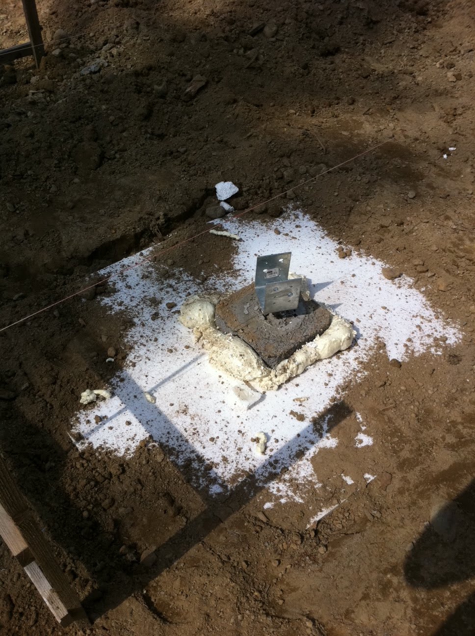 Ensin kaivettiin viisi, noin metrin syvyistä kuoppaa, pohjalle sepeliä 20cm, harjateräkset pystyyn ja betonianturat päälle.